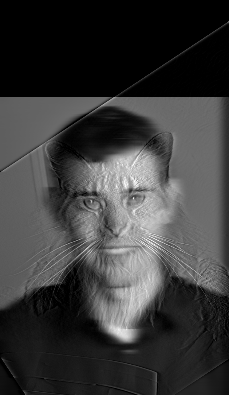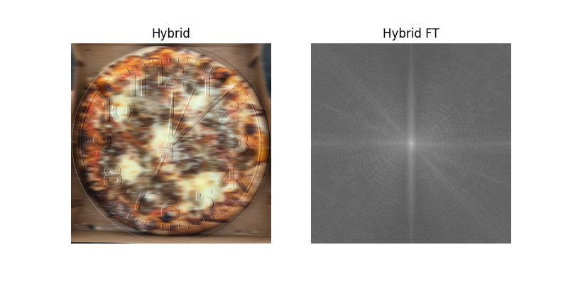 By mixing the low frequency information of one image with the high frequency of another image, we can create "hybrid images" that appears different when viewed up close and from afar. $$H=I_1 * G_1 + I_2 * (1 - G_2)$$