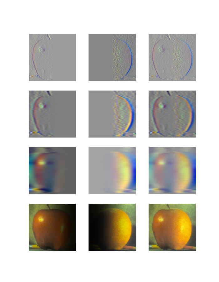 However, if the shapes are significantly different (e.g. in the penguin-eagle example), using the color only from the high frequency image seems to lead to better result. This is possibly because removing the color from the low frequency image enhances the contrast of the high frequency components, making it more clearly discernible.